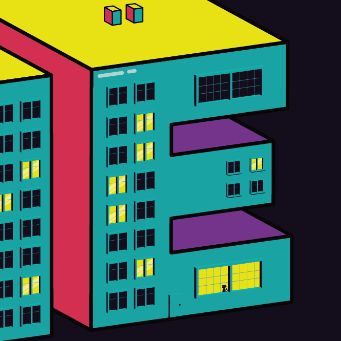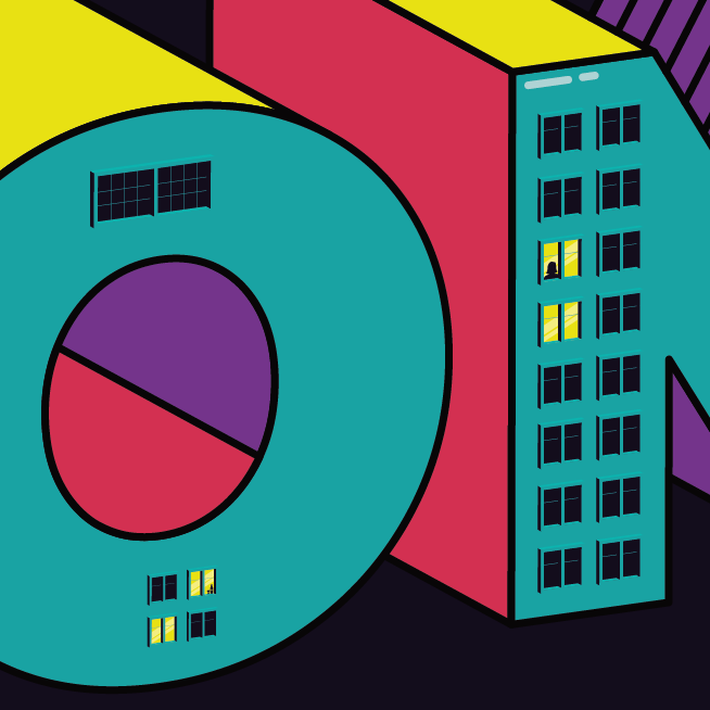 A través de esta ilustración se pretende concienciar a la sociedad de la importancia de quedarnos en casa para poder derrotar al virus. Para ello, se ha creado una composición tipográfica en perspectiva isométrica en la que las letras toman profundidad y se convierten en edificios de los que destacan sus colores dentro de la oscura noche. Además, se incluyen ventanas dentro de las cuales se pueden ver pequeños detalles que referencian a la situación (personas, copas, gatos, libros…).
